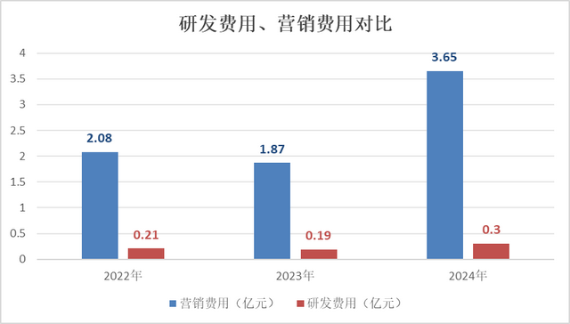 其核心矛盾在于:营销费用吞噬利润。在其成本支出上,2022年至2024年,销售及分销开支分别为5.09亿元、4.85亿元、6.88亿元,占营收的比例分别为73.7%、60.2%、56.9%。其中,公司营销费用呈增长趋势,分别为2.08亿元、1.87亿元和3.65亿元,分别占同期总营收的30.1%、23.23%和30.17%。