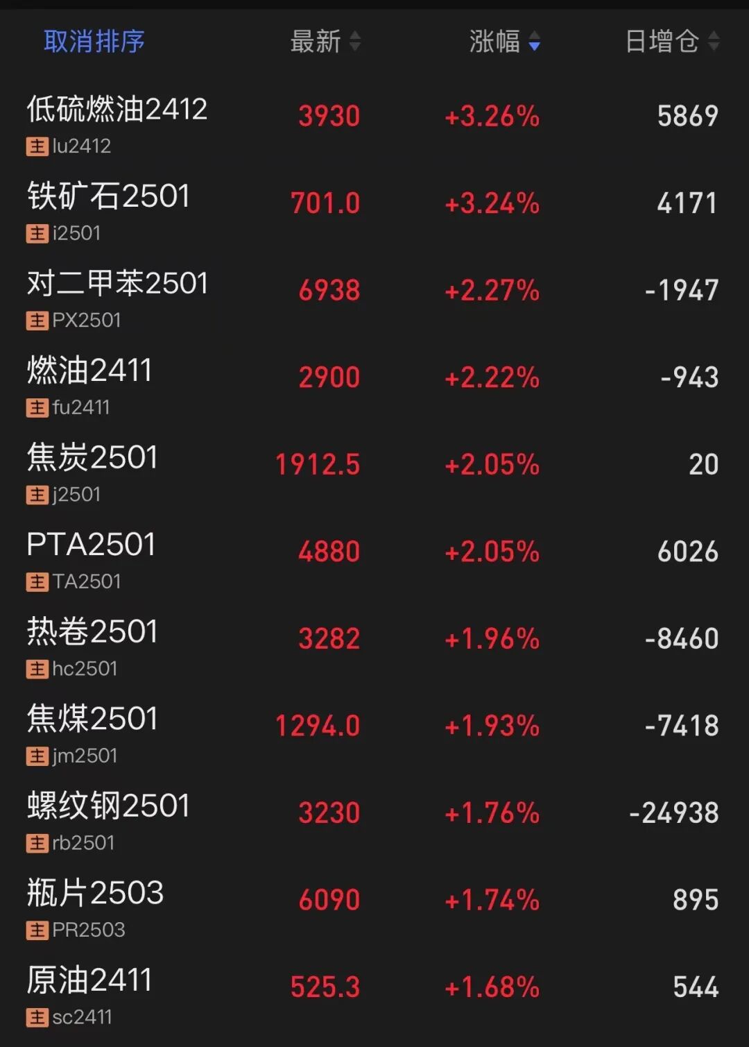 低硫燃料油涨3.26%,燃油涨2.22%,PTA涨2.05%,纸浆涨1.51%,玻璃涨1.43%,苯乙烯涨1.03%。
