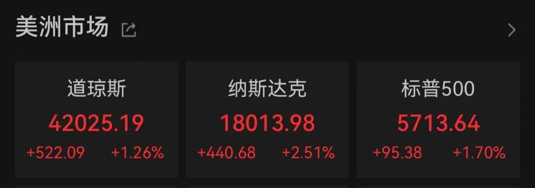 周四,美股三大指数集体收涨。截至收盘,纳指涨2.51%,标普500指数涨1.7%,道指涨1.26%。